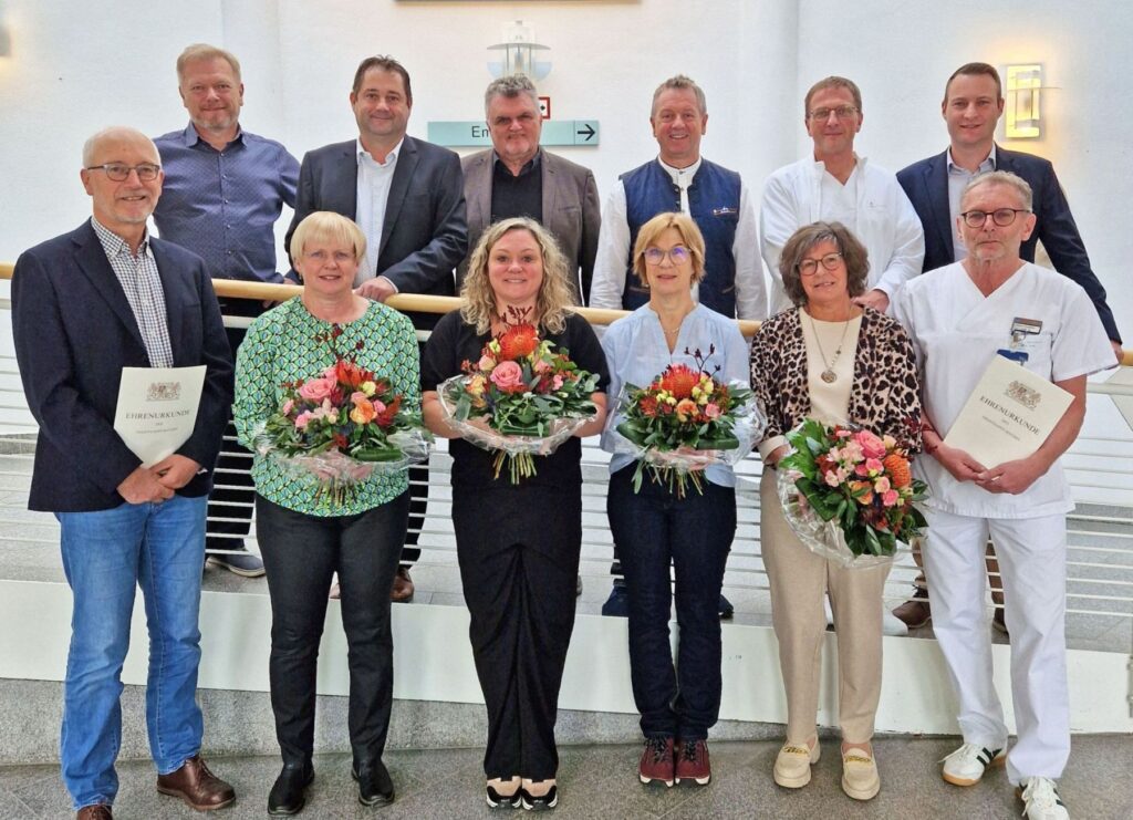 Die Dienstjubilare (vorne v.l.) Dr. Willibald Prügl (40-jähriges Jubiläum), ärztlicher Leiter / Chefarzt Innere Medizin, Heidi Ebner (40-jähriges Jubiläum), stv. Verwaltungsleiterin, Christine Grillhösl (25-jähriges Jubiläum), Pflege Station 2, Sabine Jungwirth (40-jähriges Jubiläum), OP-Pflege, Irmgard Zanetti (40-jähriges Jubiläum), Küche und Johann Kienböck (40-jähriges Jubiläum), Chefarzt Innere Medizin, feierten mit (hinten v.l.) Betriebsratsmitglied Guido Konkol, Verwaltungsleiter Alexander Dötter, Geschäftsführer Klaus Seitzinger, Leitung OP-Pflege Peter Neuer, Leitung Pflege Station 2 Franz Heindl sowie Pflegedirektor Martin Marek.