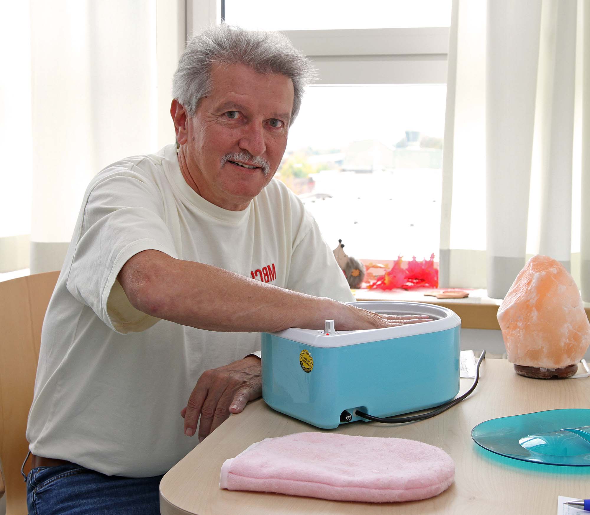 Schmerzlindernde Wärmebehandlung: Patient Josef Blasi hüllt seine schmerzende Hand täglich in circa 60 Grad warmes Paraffinwachs. Nach der 14-tägigen stationären Therapie verlässt er das Krankenhaus Vilshofen in einem deutlich besseren Zustand, als er gekommen ist. Im Interview berichtet er.