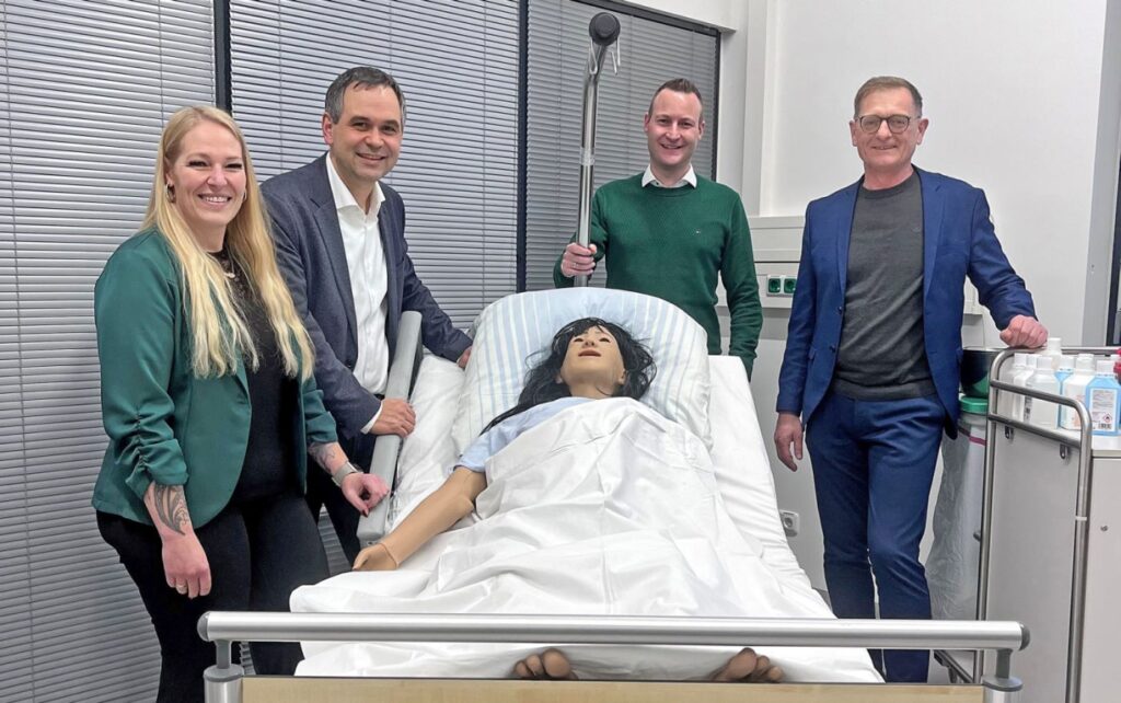 Beim Rundgang durch die Pflegefachschule Rotthalmünster: Schulleiterin Sabrina Grünleitner (v.l.) mit Landrat Raimund Kneidinger, Pflegedirektor Martin Marek und Geschäftsführer Josef Mader im praktischen Demo-Raum mit der Übungspuppe “Nursing Anne”.